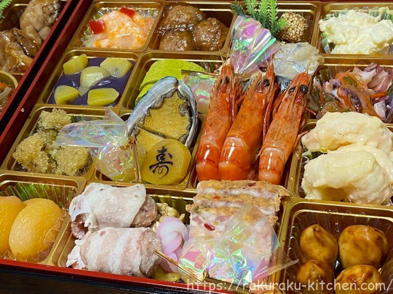 様々な料理が入っていたので飽きることなくちょこちょこ食べることができました。数の子を使った料理が多かったように感じました。ただ、いろいろな味にアレンジされていたのでどれも楽しめました。