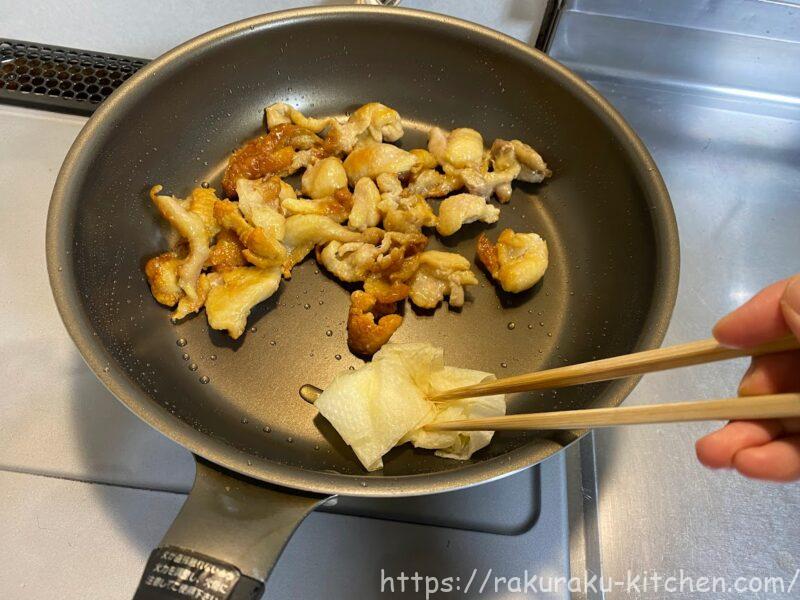 ▼フライパンで余分な脂をとりながらカリカリに焼きます