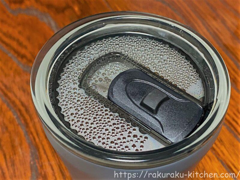 試しにコーヒーが入った状態で真っ逆さまにしてみたら、飲み口部分から少し漏れました。ふた自体はパッキンで強力に密閉されているので蓋の隙間からは漏れ出しませんが、飲み口の開閉部分は軽く動くのでそこから漏れ出します。なので、逆さまにしたり横にしたりするのはNGです。
