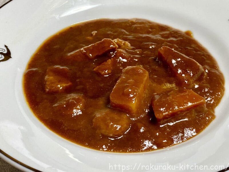 今回はレトルトパウチのままお湯で約5分温めてからお皿に盛りつけました。