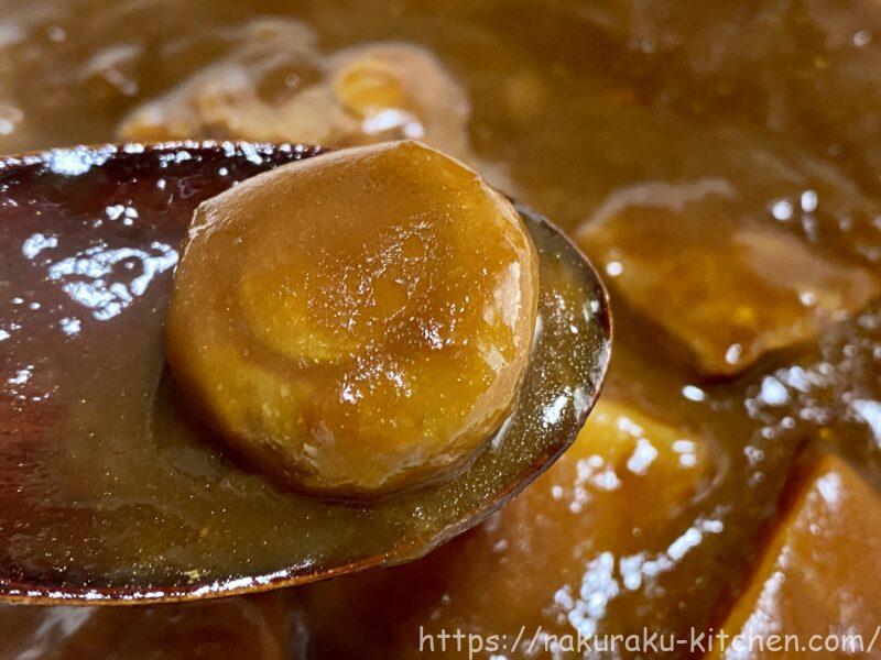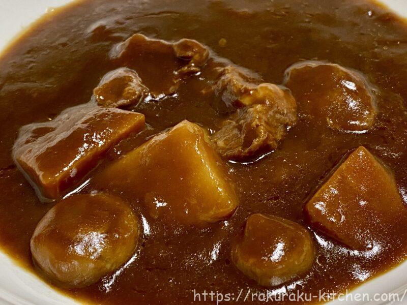 原材料:野菜(人参、じゃがいも、玉ねぎ)、牛肉(和牛(国産))、マッシュルーム水煮、小麦粉、食用油脂(牛脂)、砂糖、トマトケチャップ、食塩、チキンエキス、醤油、たん白加水分解物、オニオンパウダー、おろしにんにく、バター/カラメル色素、(一部に小麦・乳成分・牛肉・豚肉・鶏肉・大豆を含む)
