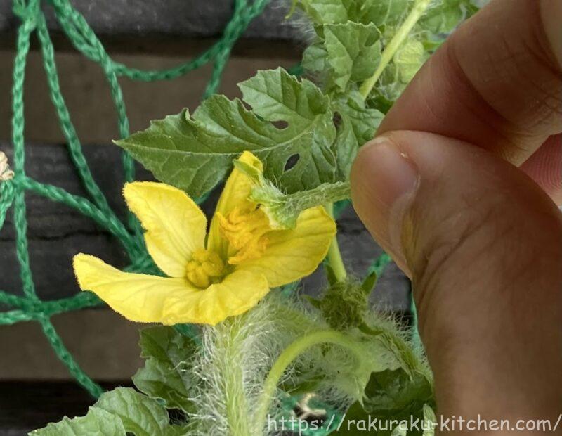 雌花が2つ咲いていて、雄花も咲いていたので、人口受粉させました。