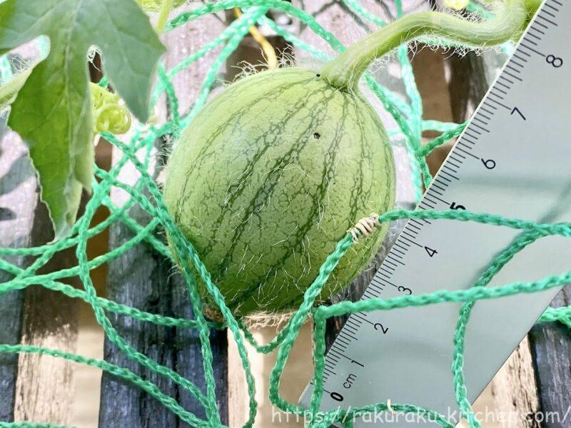 6/19に人工授粉した小玉スイカがすくすく成長しています。昨日今日は気温が30℃以上になってしばらく暑い日が続くみたいなので成長が加速するとよいのですが。