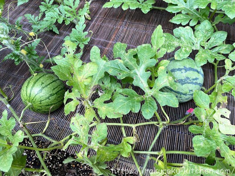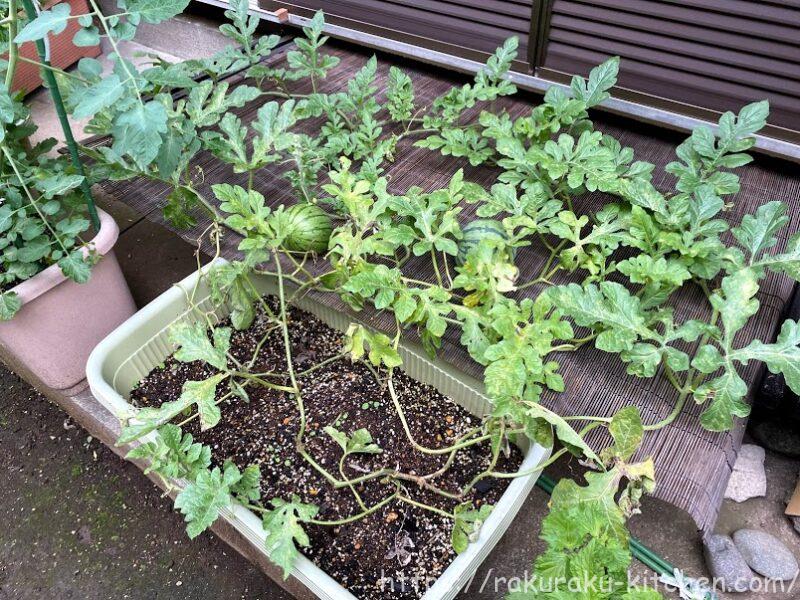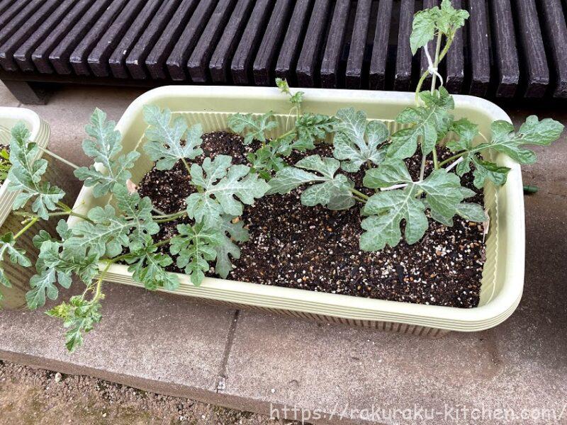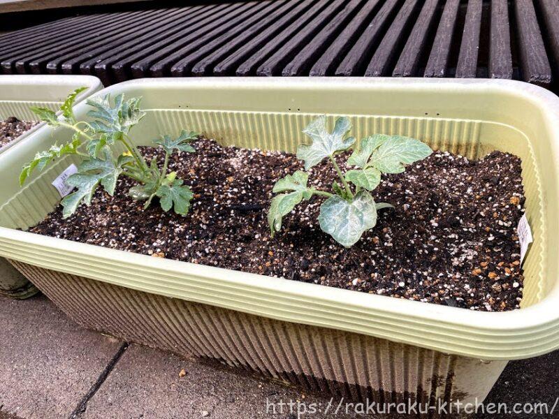 今年は大玉スイカと小玉スイカの苗をそれぞれ1株ずつ購入しました。各2個、合計4個の収獲を目指します。