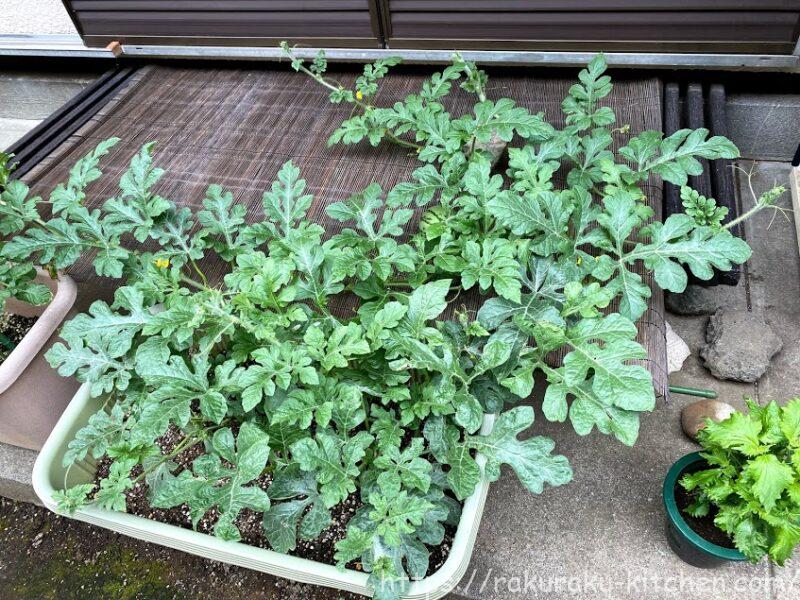 日々の世話は、土が乾燥したら適当に水をあげるくらいですが、勢いよく育っています。去年もそうですが、スイカは適当でもよく育ちます。