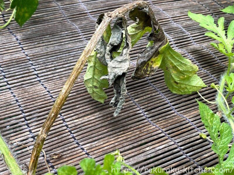 根元の葉がだいぶ枯れてしまいました。ネットで調べたところ、『つる枯病』によく似ています。すいかは湿気に弱く、梅雨の時期は病気にかかりやすいようです。