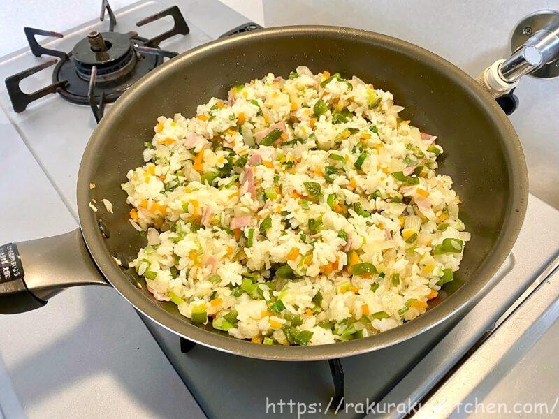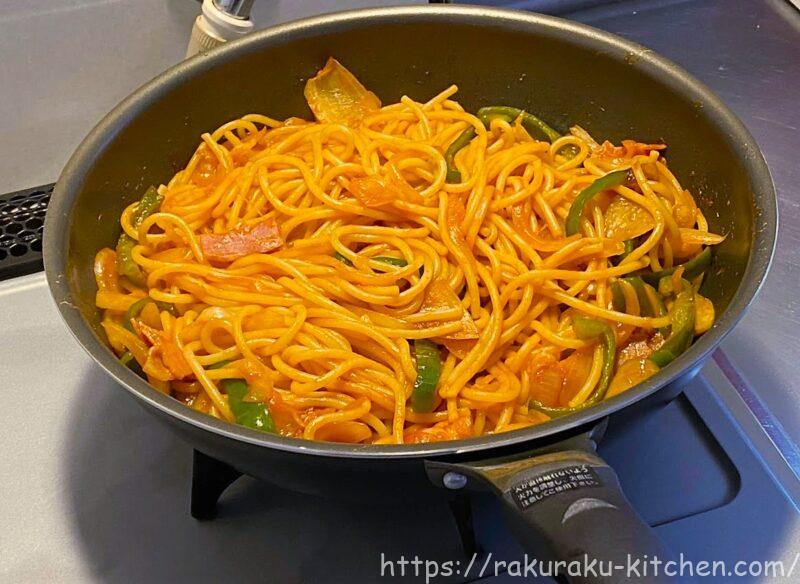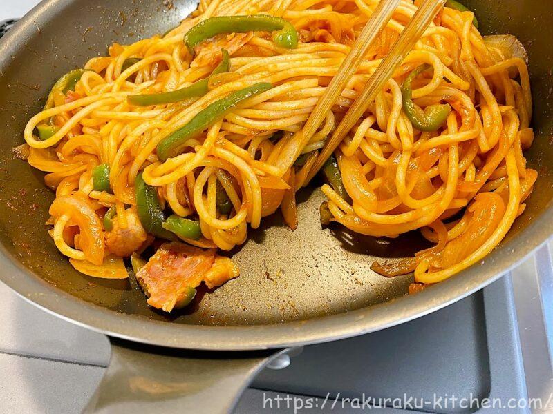 普通のフライパンでナポリタンを作るとケチャップを入れたあとに焦げ付きやすいですが、suruttoフライパンだとスルスルで全くこびりつきません。