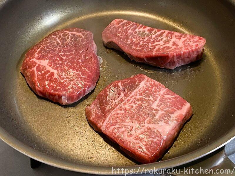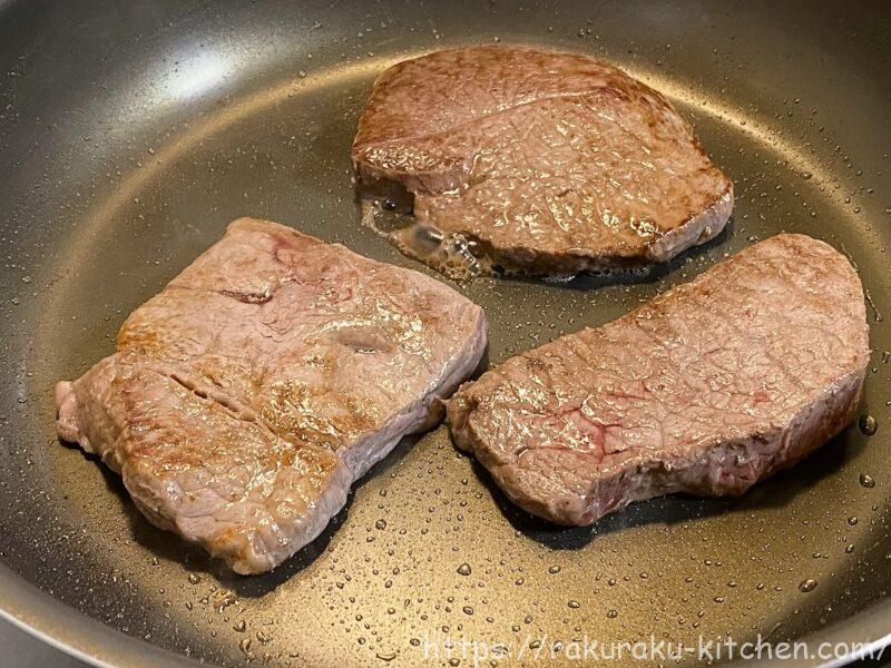 油をひかずにステーキ肉を焼いてみました。比較的赤身の多い部分です。