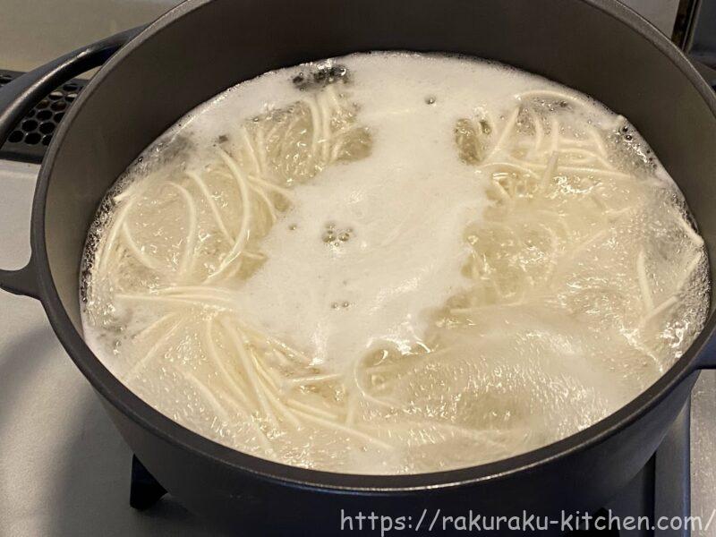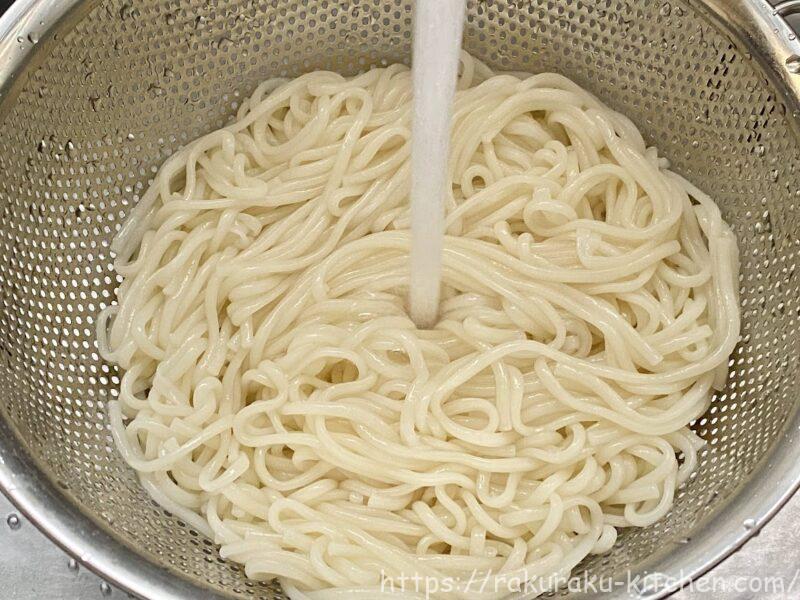 ゆであがったら、手早くザルにとって冷水で水洗いします。