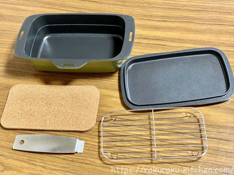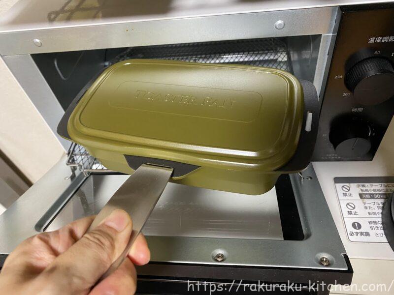 唯一使いにくいと感じたのがフタが熱くなるので開けるのに少し手間がかかる点です。付属のハンドルでトースターから出すのはとても簡単ですが、そのあとアツアツ状態でフタをあけるにはミトンなどを使う必要があります(容器やフタが非常に熱いため)。