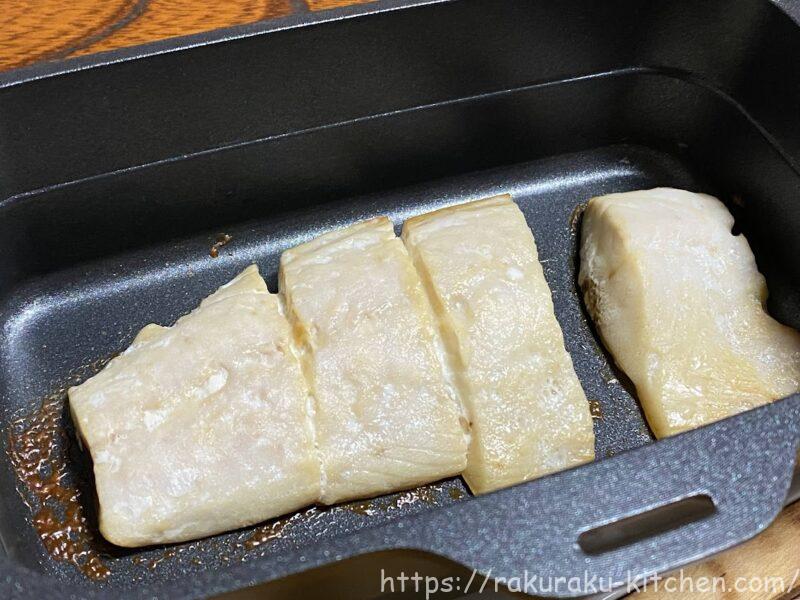 オーブントースターで10分位焼きます。今回は小さめの切身だったので10分で完全に焼けていました。