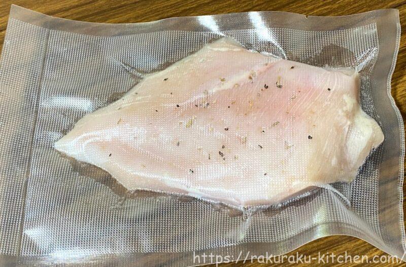 鶏むね肉を真空密封して、低温調理すればサラダチキンができます。今まではジップロップに入れていましたが、真空密封したほうがしっとりできるような気がします。