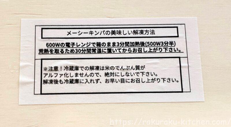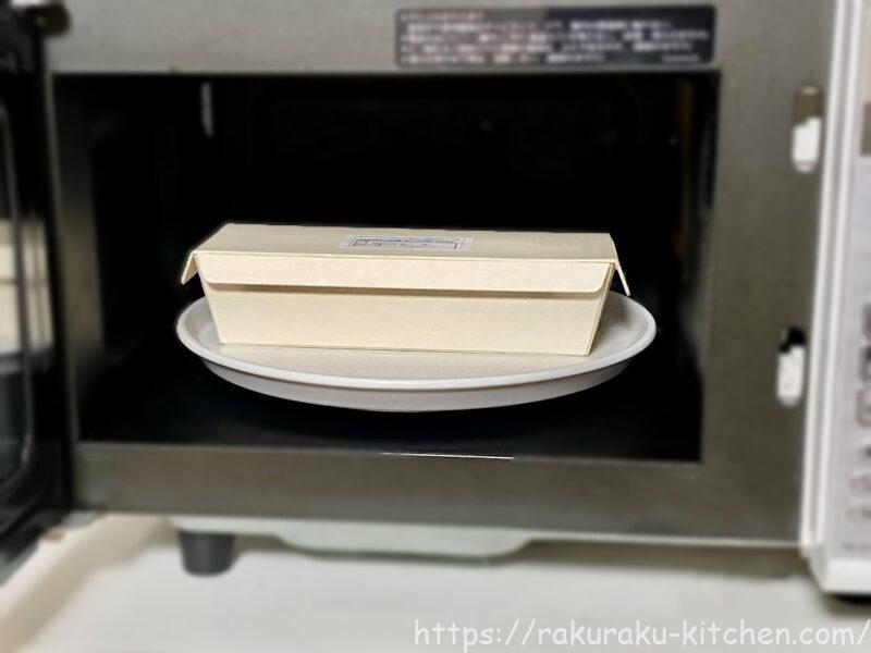 冷凍庫から取り出して箱のまま電子レンジ600Wで3分加熱(500wの場合は3分30秒)。その後、室温で30分置き、加熱ムラや荒熱を取ってから食べます。