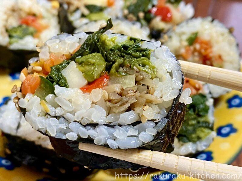 メーシーのヴィーガンキンパは無農薬のお米にこだわり、残留農薬ゼロの石川県産「ピロール米」を使用しています。これに7種の野菜を入れて、職人が一本一本、巻き上げて作られています。