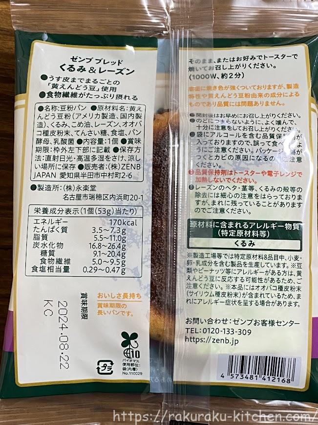 原材料名:黄えんどう豆粉(アメリカ製造、国内製造)、くるみ、こめ油、レーズン、オオバコ種皮粉末、てんさい糖、食塩、パン酵母、乳酸菌